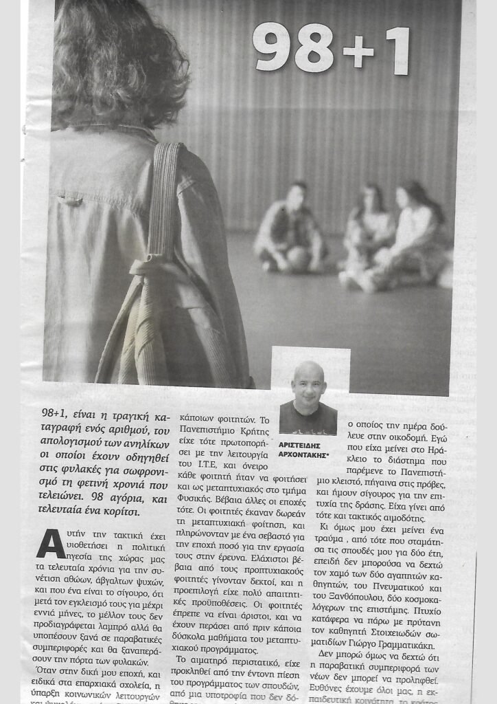 Ευχαριστώ τα Χανιώτικα νέα που δεν με ξεχνάνε και τέλος της χρονιάς δημοσίευσαν το κείμενό μου “98+1”. Εύχομαι σε όλο το προσωπικό και στους αναγνώστες ΚΑΛΗ ΧΡΟΝΙΑ και για την εφημερίδα να βρίσκεται πάντα στις επάλξεις της έγκυρης και έγκαιρης ενημέρωσης!