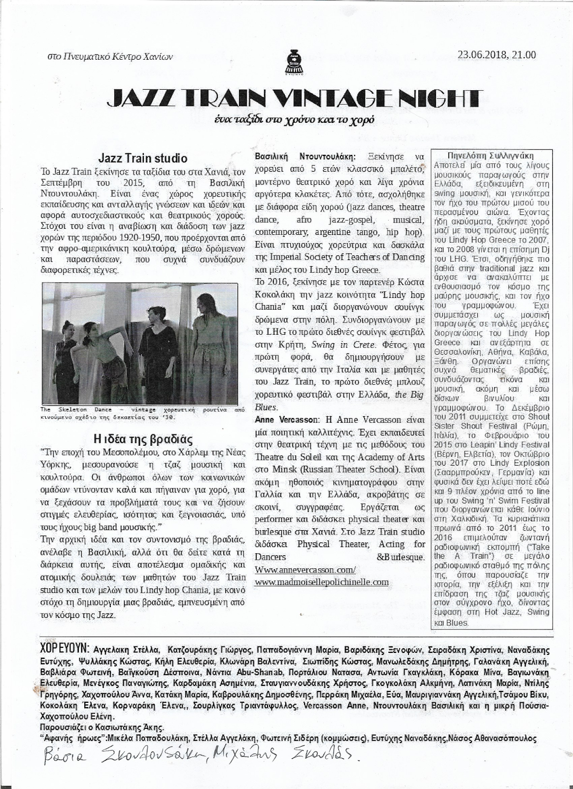 Στον υπέροχο χώρο του Πνευματικού Κέντρου Χανίων χθες το βράδυ μαγευτήκαμε απ’ τους χορούς της παρέας Jazz Train studio. Μας μετέφεραν στην εποχή του Μεσοπολέμου στο Χάρλεμ της Νέας Υόρκης όπου μεσουρανούσε η τζαζ μουσική και κουλτούρα Την ιδέα και το συντονισμό της βραδιάς είχε η Βασιλική Ντουντουλάκη με συνεργάτες τον παρτενέρ Κώστα Κοκολάκη και την Anne Vercasson.